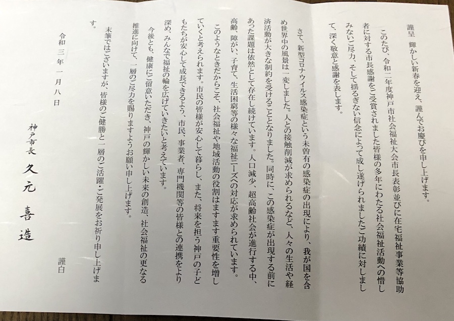 感謝状をいただきました